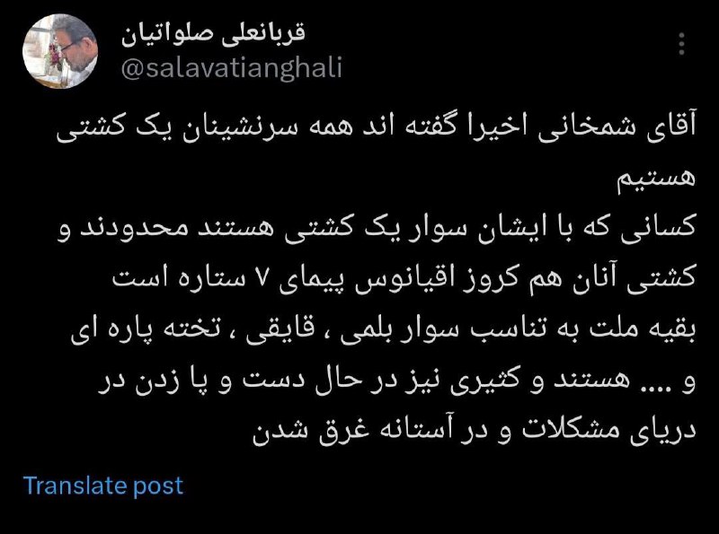 🔺همه سوار یک کشتی نیستیم آقای شمخانی؛ بعضی در کروز، بعضی در قایق سوراخ! ✅ دیدگاهتان را بنویسید لغو پاسخدیدگاهبرای ارسال دیدگاه نام یا نامکاربری خود را وارد کنید برای ارسال دیدگاه آدرس ایمیل خود را وارد کنید آدرس وبسایت خود را وارد کنید (اختیاری) ذخیره نام، ایمیل و وبسایت من در مرورگر برای زمانی که دوباره دیدگاهی مینویسم. Δ