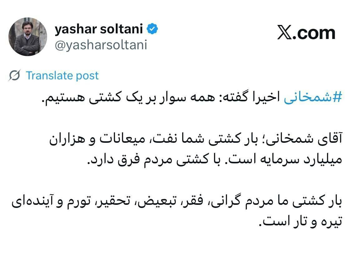 🔸️آقای شمخانی؛ بار کشتی شما نفت، میعانات و هزاران میلیارد سرمایهست، با کشتی مردم فرق داره 🔸️ بار کشتی ما مردم گرونی، فقر، تبعیض، تحقیر، تورم و آینده تیره و تاره ✅ دیدگاهتان را بنویسید لغو پاسخدیدگاهبرای ارسال دیدگاه نام یا نامکاربری خود را وارد کنید برای ارسال دیدگاه آدرس ایمیل خود را وارد کنید آدرس وبسایت خود را وارد کنید (اختیاری) ذخیره نام، ایمیل و وبسایت من در مرورگر برای زمانی که دوباره دیدگاهی مینویسم. Δ
