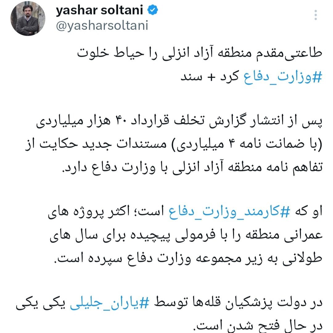 پس از انتشار گزارش تخلف قرارداد ۴۰ هزار میلیاردی (با ضمانت نامه ۴ میلیاردی) مستندات جدید حکایت از تفاهم نامه منطقه آزاد انزلی با وزارت دفاع دارد.