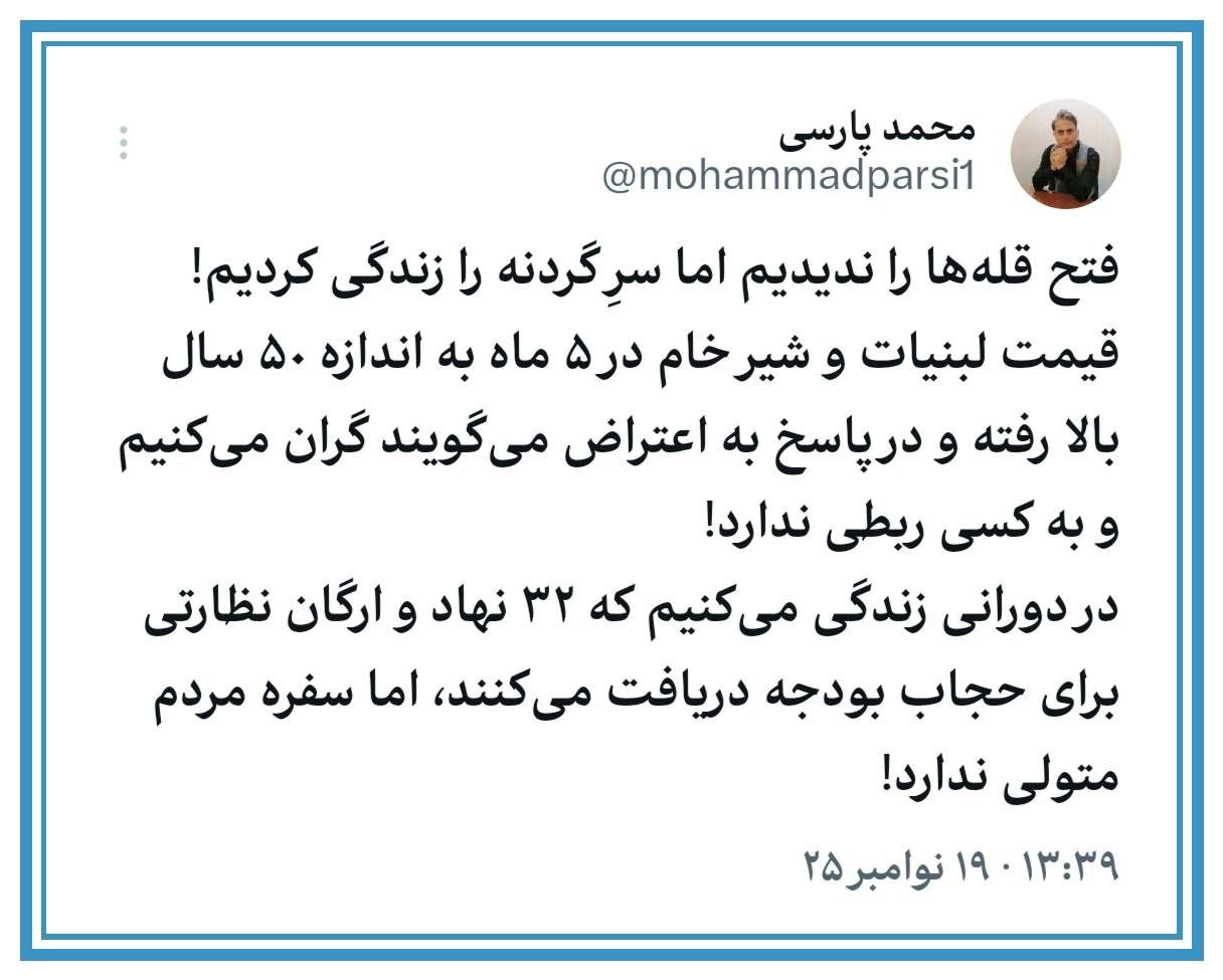 در دورانی زندگی میکنیم که ۳۲ نهاد و ارگان نظارتی برای حجاب بودجه دریافت میکنند، اما سفره مردم متولی ندارد!