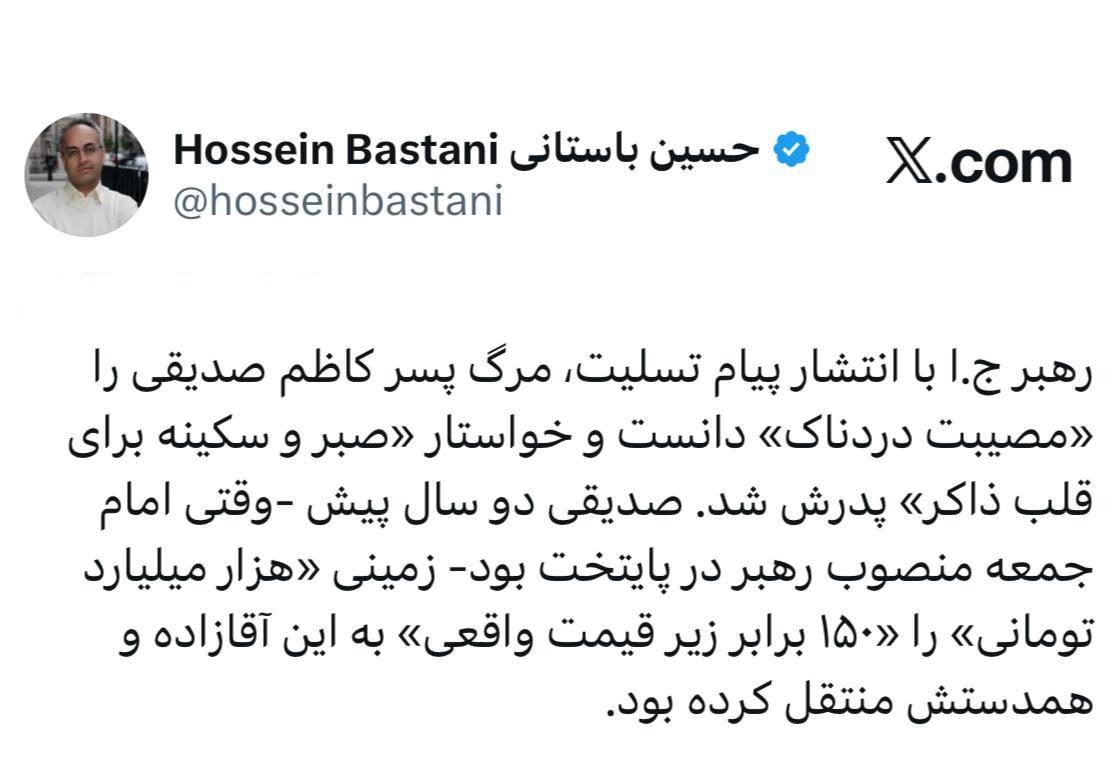حسین باستانی:رهبر ج.ا با انتشار پیام تسلیت، مرگ پسر کاظم صدیقی را «مصیبت دردناک» دانست و خواستار «صبر و سکینه برای قلب ذاکر» پدرش شد. صدیقی دو سال پیش -وقتی امام جمعه منصوب رهبر در پایتخت بود- زمینی «هزار میلیارد تومانی» را «۱۵۰ برابر زیر قیمت واقعی» به این آقازاده و همدستش منتقل کرده بود.