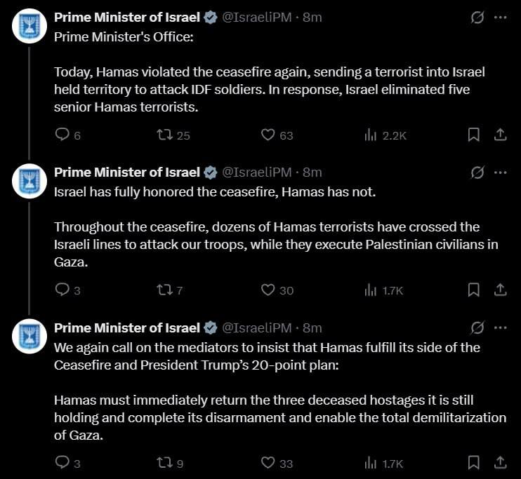 «امروز، حماس بار دیگر آتشبس را نقض کرد و یک عامل تروریستی را به داخل مناطق تحت کنترل اسرائیل فرستاد تا به سربازان ارتش این کشور حمله کند. در پاسخ، اسرائیل پنج عضو ارشد حماس را از بین برد.