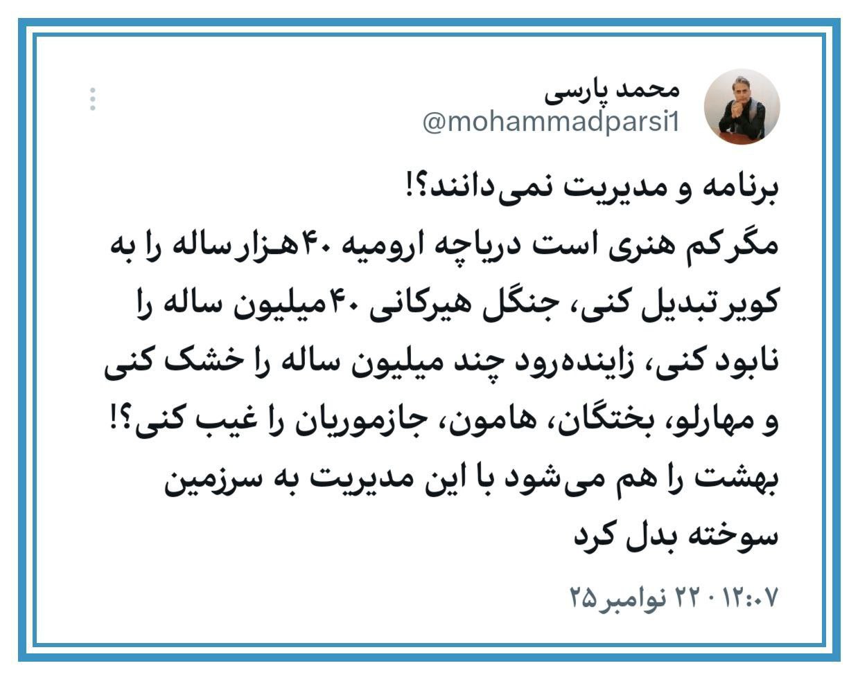 🔸مگر کم هنری است دریاچه ارومیه ۴۰هـزار ساله را به کویر تبدیل کنی، جنگل هیرکانی ۴۰میلیون ساله را نابود کنی، زایندهرود چند میلیون ساله را خشک کنی و مهارلو، بختگان، هامون، جازموریان را غیب کنی؟!