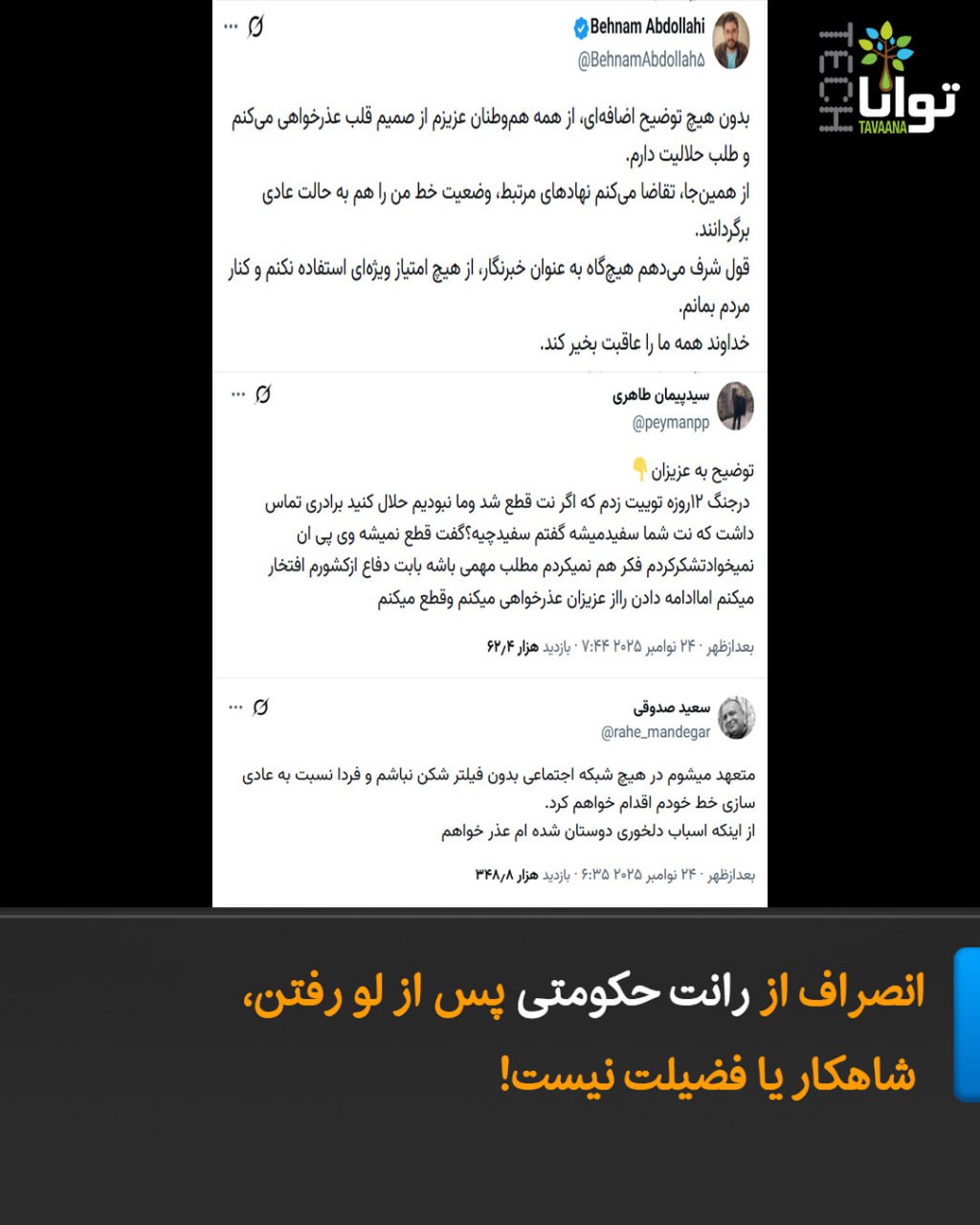 این ادعا نه از سر وجدان، بلکه از سر ترس و بیآبرویی است. کسی که درد مردم را میفهمید، همان روز اول دست رد به سینه این رانت میزد. نکته مهم تر اینکه کنار گذاشتن ابزار رانت، بعد از اینکه دستتان رو شده، فضیلت نیست!