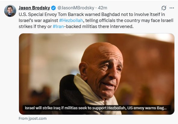 فرستاده ویژه آمریکا، تام باراک، به بغداد هشدار داد که در جنگ اسرائیل علیه حزب الله لبنان مداخله نکند و به مقامات گفت که اگر عراق یا شبهنظامیان مورد حمایت رژیم ایران در آنجا وارد عمل شوند، ممکن است با حملات اسرائیلی مواجه شود. دیدگاهتان را بنویسید لغو پاسخدیدگاهبرای ارسال دیدگاه نام یا نامکاربری خود را وارد کنید برای ارسال دیدگاه آدرس ایمیل خود را وارد کنید آدرس وبسایت خود را وارد کنید (اختیاری) ذخیره نام، ایمیل و وبسایت من در مرورگر برای زمانی که دوباره دیدگاهی مینویسم. Δ