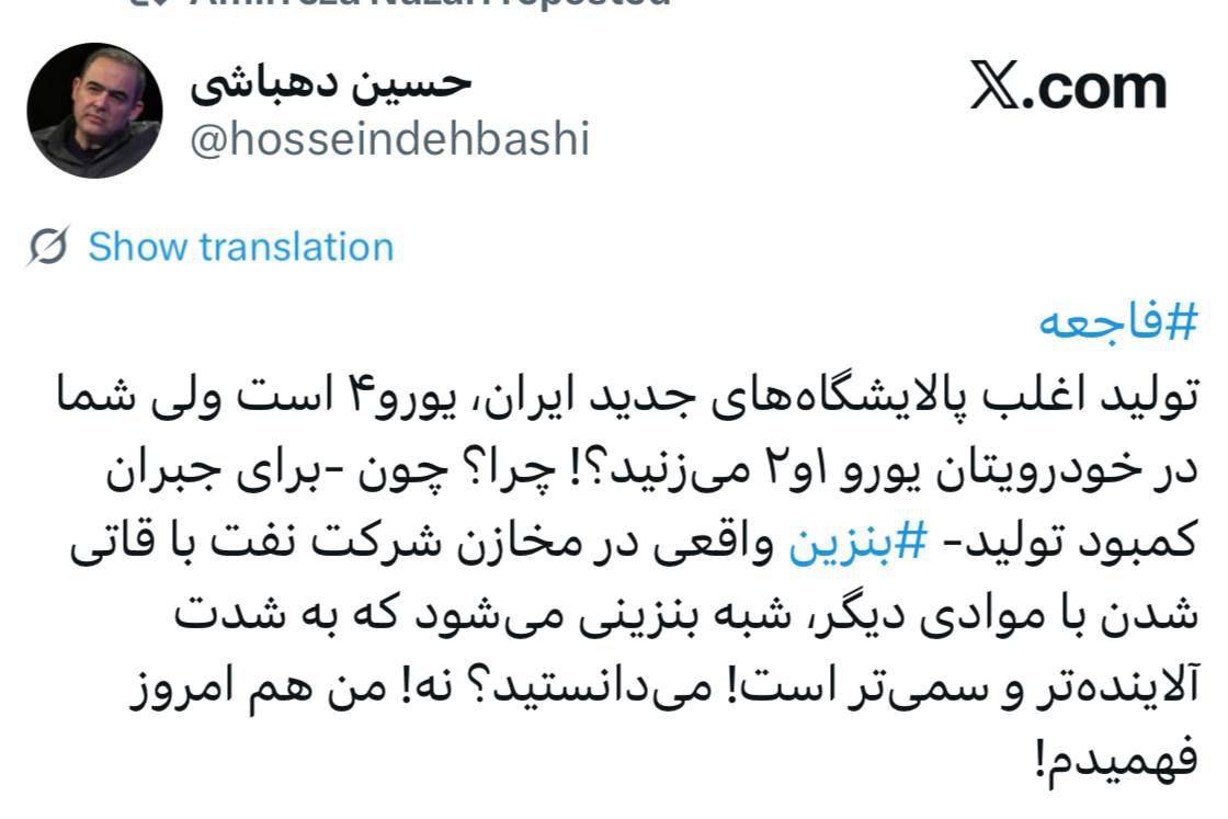 تولید اغلب پالایشگاههای جدید ایران، یورو۴ است ولی شما در خودرویتان یورو ۱و۲ میزنید؟! چرا؟ چون -برای جبران کمبود تولید- #بنزين واقعی در مخازن شرکت نفت با قاتی شدن با موادی دیگر، شبه بنزینی میشود که به شدت آلایندهتر و سمیتر است! میدانستید؟ نه! من هم امروز فهمیدم