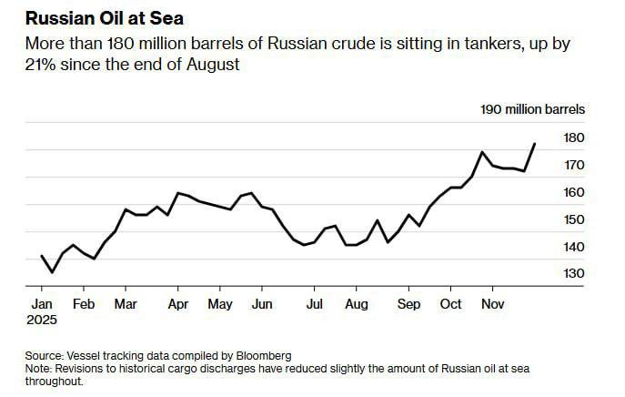 تا پایان نوامبر، بیش از ۱۸۰ میلیون بشکه نفت روسیه در دریا منتظر مشتری بود که این رقم نسبت به ماه اوت ۲۱ درصد افزایش یافته و بالاترین سطح ذخیره نفت در دریا طی چند ماه اخیر محسوب میشود.