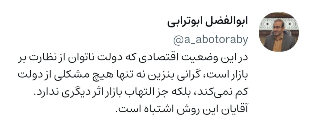🔺در این وضعیت اقتصادی که دولت ناتوان از نظارت بر بازار است، گرانی بنزین نه تنها هیچ مشکلی از دولت کم نمیکند، بلکه جز التهاب بازار اثر دیگری ندارد. آقایان این روش اشتباه است. ✅ دیدگاهتان را بنویسید لغو پاسخدیدگاهبرای ارسال دیدگاه نام یا نامکاربری خود را وارد کنید برای ارسال دیدگاه آدرس ایمیل خود را وارد کنید آدرس وبسایت خود را وارد کنید (اختیاری) ذخیره نام، ایمیل و وبسایت من در مرورگر برای زمانی که دوباره دیدگاهی مینویسم. Δ