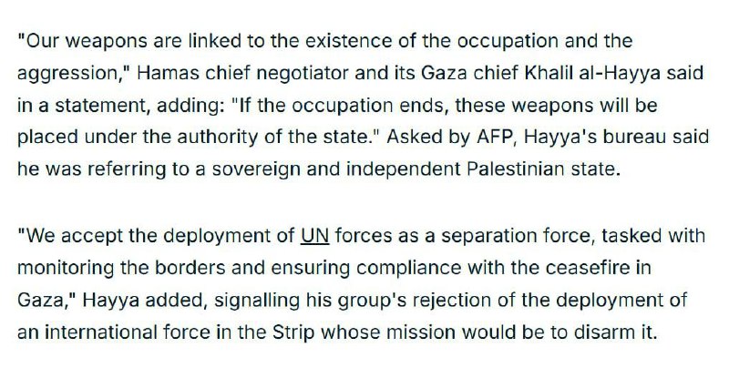 او همچنین گفت حماس با استقرار نیروهای سازمان ملل برای نظارت بر مرزها و اجرای آتشبس در غزه موافق است، اما هرگونه نیروی بینالمللی را که مأموریتش خلع سلاح حماس باشد، رد میکند.