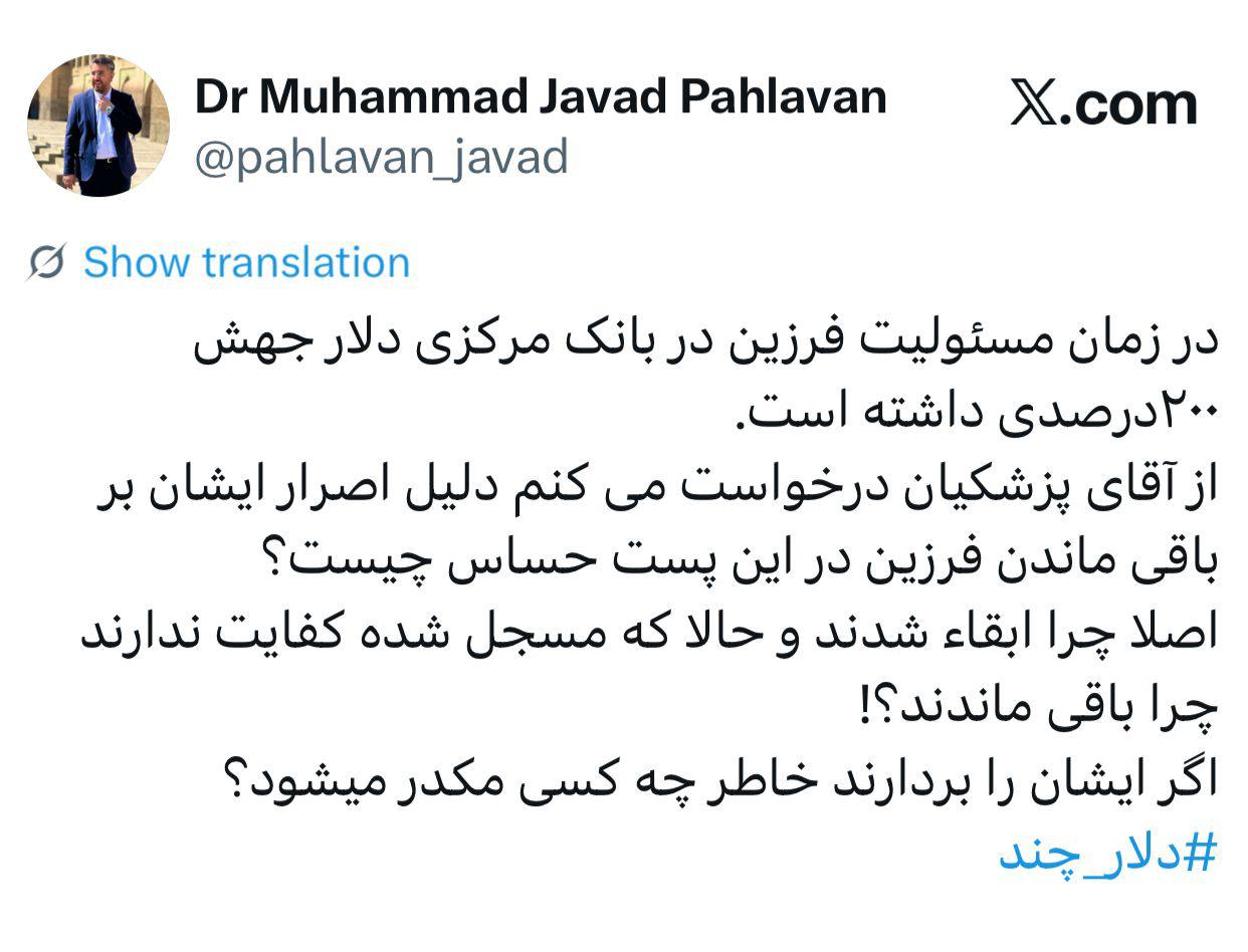 در زمان مسئولیت فرزین در بانک مرکزی دلار جهش 200 درصدی داشته است.از آقای پزشکیان درخواست می کنم دلیل اصرار شان بر باقی ماندن فرزین در این پست حساس چیست؟اصلا چرا ابقاء شدند و حالا که مسجل شده کفایت ندارند چرا باقی ماندند؟! اگر ایشان را بردارند خاطر چه کسی مکدر می شود؟