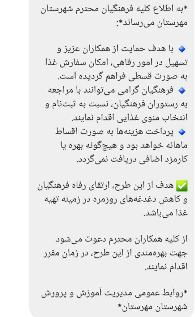در کشور ایران یک معلم میتونه یک پرس غذای قسطی خریداری کند، ببرد در منزلش پنج نفری نوش جان کنند. دیدگاهتان را بنویسید لغو پاسخدیدگاهبرای ارسال دیدگاه نام یا نامکاربری خود را وارد کنید برای ارسال دیدگاه آدرس ایمیل خود را وارد کنید آدرس وبسایت خود را وارد کنید (اختیاری) ذخیره نام، ایمیل و وبسایت من در مرورگر برای زمانی که دوباره دیدگاهی مینویسم. Δ