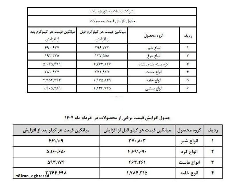 🔺 این شرکت در خرداد امسال نیز پس از تغییر قیمت شیر خام به ۲۳ هزار تومان نیز نرخ محصولات خود را حدود گران کرده بود./ایران اقتصادی