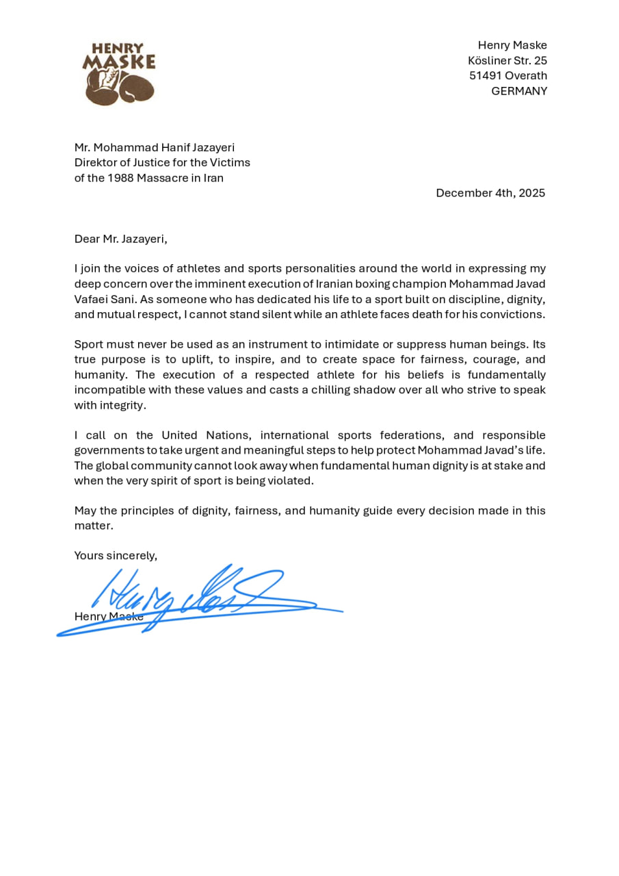🟣هنری ماسکه، قهرمان سابق بوکس IBF و دارنده مدال طلای المپیک، از سازمان ملل و فدراسیونهای بینالمللی ورزش میخواهد تا ایران را برای توقف اعدام بوکسور محمدجواد وفاییثانی تحت فشار قرار دهند.