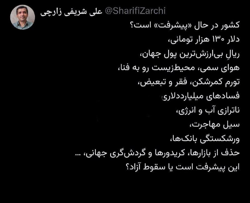 🔺کشور در حال پیشرفت است؟ دلار ۱۳۰ تومانی؛ ریال بیارزش؛ هوای سمی؛ تورم کمرشکن؛ ناترازی آب و انرژی؛ سیل مهاجرت؛ این پیشرفت است یا سقوط آزاد؟ ✅ دیدگاهتان را بنویسید لغو پاسخدیدگاهبرای ارسال دیدگاه نام یا نامکاربری خود را وارد کنید برای ارسال دیدگاه آدرس ایمیل خود را وارد کنید آدرس وبسایت خود را وارد کنید (اختیاری) ذخیره نام، ایمیل و وبسایت من در مرورگر برای زمانی که دوباره دیدگاهی مینویسم. Δ