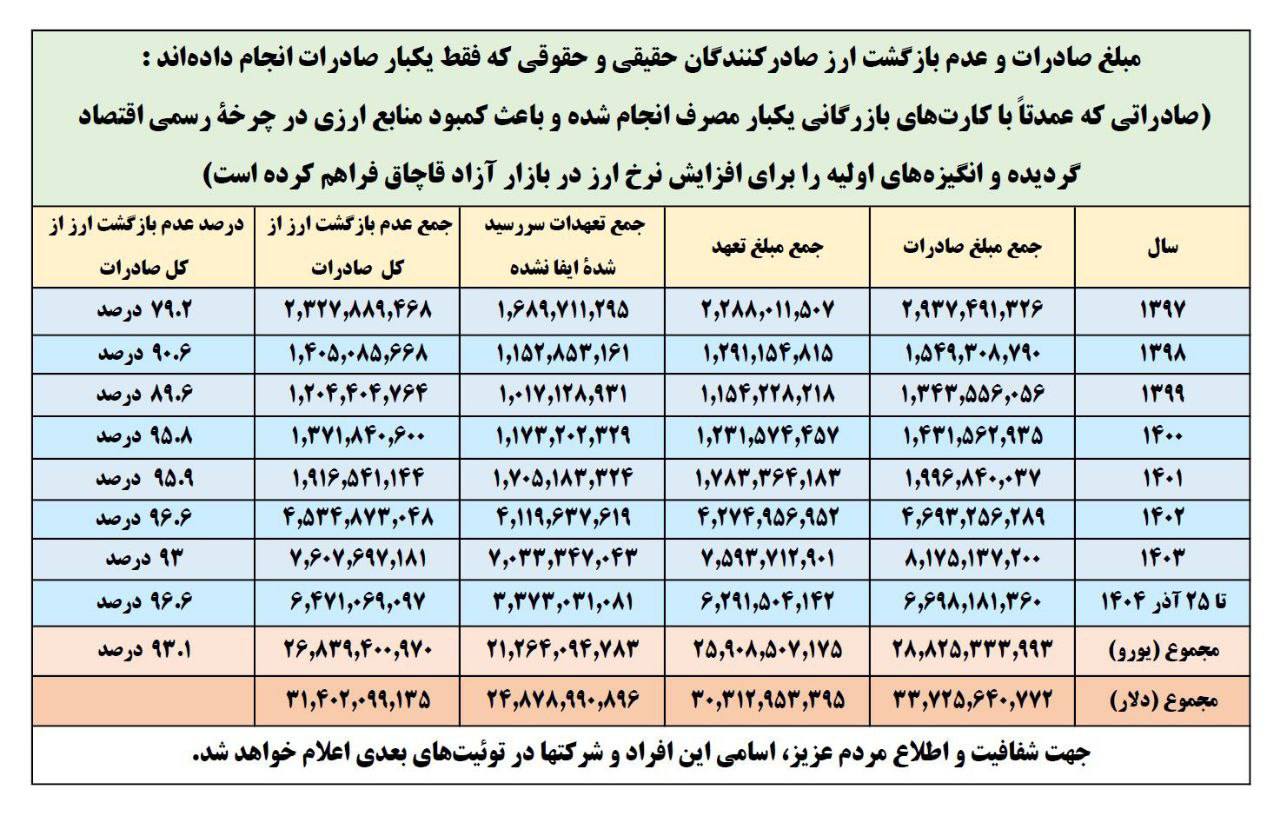 🔺از مجموع ۳۳.۷ میلیارد دلار صادراتی که توسط افراد حقیقی و حقوقی(فقط یکبار آنهم عمدتا با کارتهای یکبار مصرف انجام شده)، بیش از ۹۳ درصد از ارزها برنگشته است!
